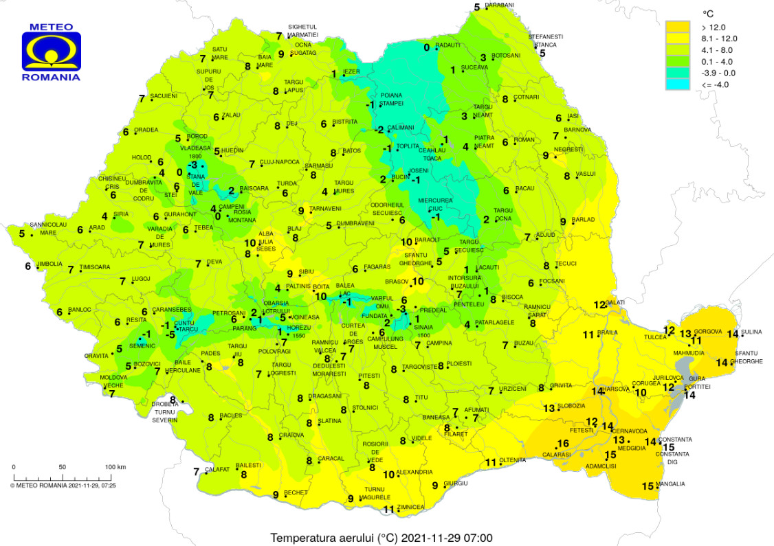Temperaturile maxime se vor încadra, în general, între 6 și 14 grade, iar cele minime între -4 și 5 grade, mai ridicate pe litoral. Pe spaţii restrânse vor fi condiții de ceață.