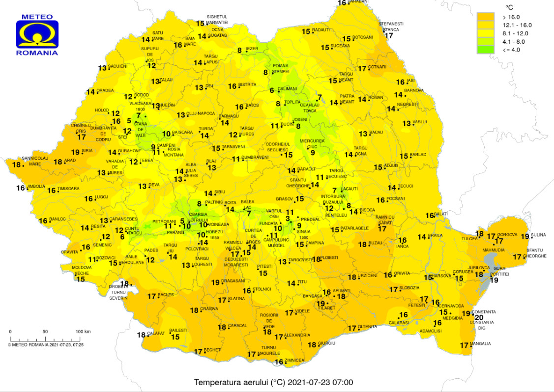 Vremea se menține una plăcută în data de 23 iulie, cerul va fi variabil, cu înnorări temporare după-amiaza şi seara, iar pe arii restrânse în zona de munte şi izolat în restul teritoriului, se vor semnala ploi de scurtă durată şi, posibil, descărcări electrice. Vântul va sufla slab şi moderat, cu uşoare intensificări pe litoral. Temperaturile maxime se vor situa între 23 şi 32 de grade.