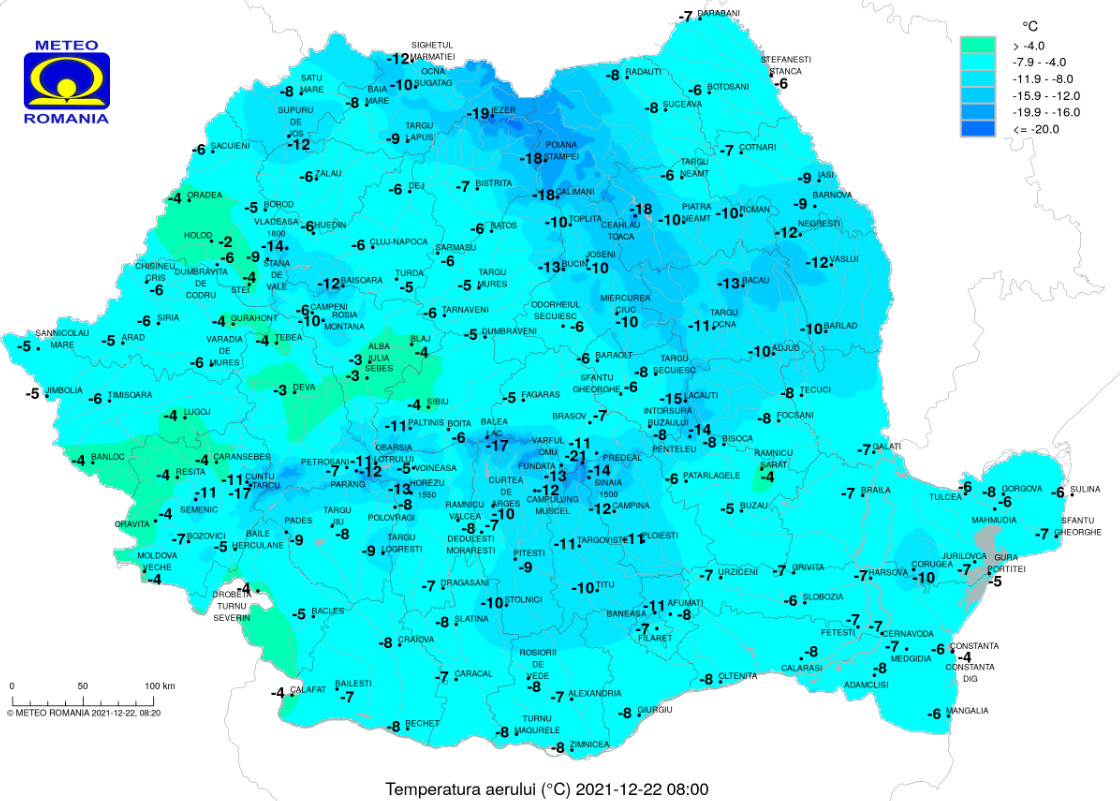 Vremea va fi rece, geroasă dimineaţa, local în nord şi centru şi pe spaţii mici în restul teritoriului. Temperaturile maxime se vor încadra, în general, între -4 şi 3 grade.