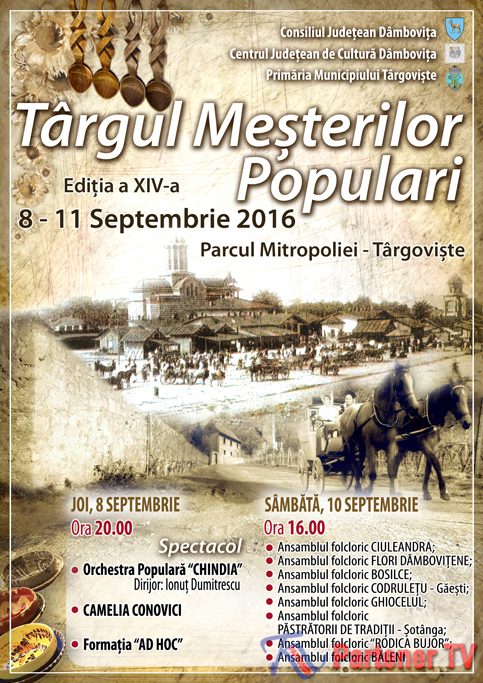Acestea sunt doar câteva argumente care stau la baza continuării unui eveniment devenit simbol atât pentru Centrul Județean de Cultură Dâmbovița, cât și pentru municipiul Târgoviște, dar, în egală măsură, și pentru județ, un eveniment ajuns anul acesta la cea de-a XIV-a ediție și care se va desfășura în perioada 8-11 septembrie 2016. Deschiderea târgului va avea loc joi, 8 septembrie, la ora 17:30, în Parcul Mitropoliei.