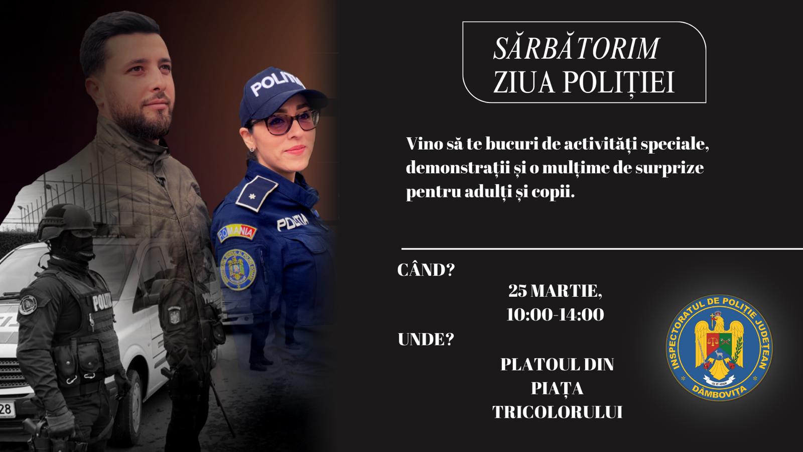 Ziua Poliției Române,luni, 25 martie, începând cu ora 10:00, ateliere și expoziții cu tehnica din dotare pe platoul din fața Instituției Prefectului Dâmbovița.